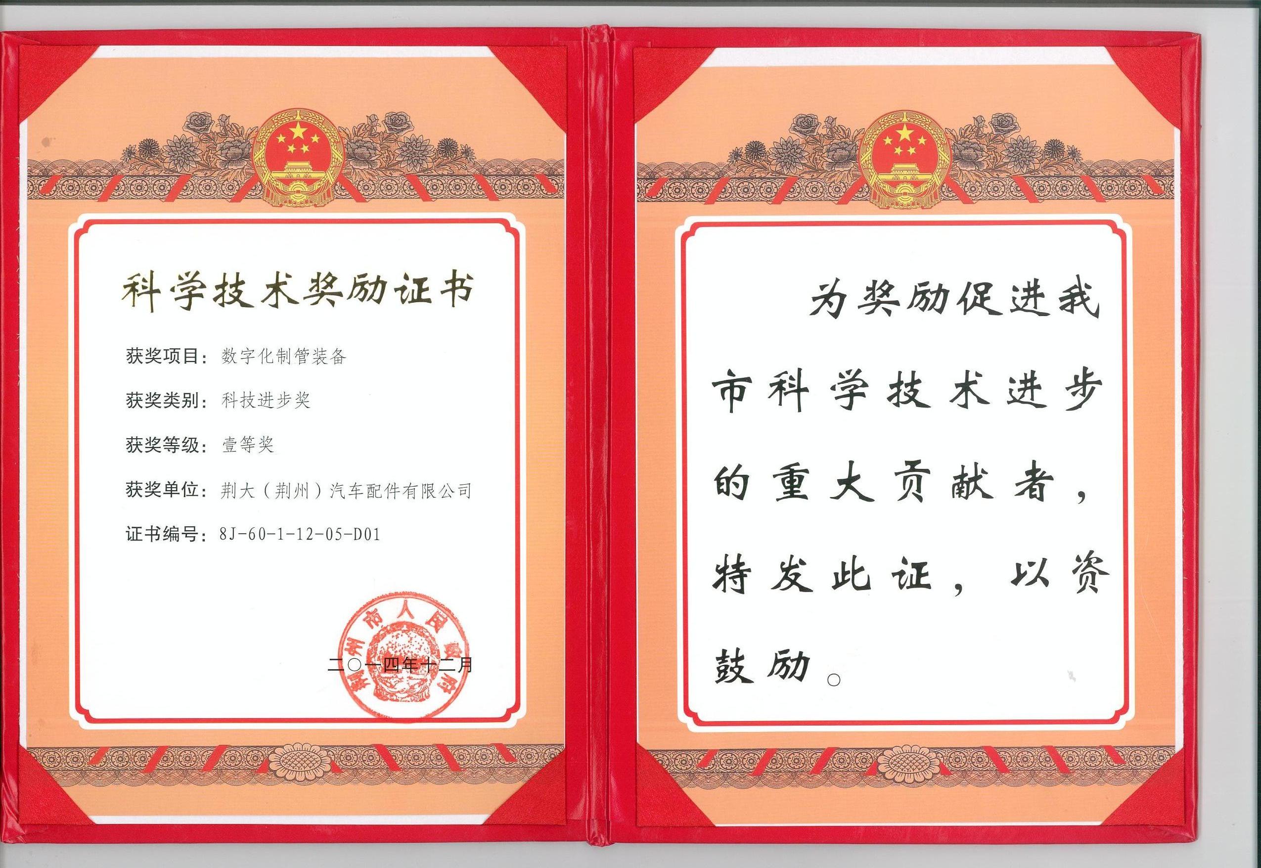 《數(shù)字化制管裝備》獲得2014年荊州市科技進(jìn)步一等獎(jiǎng)